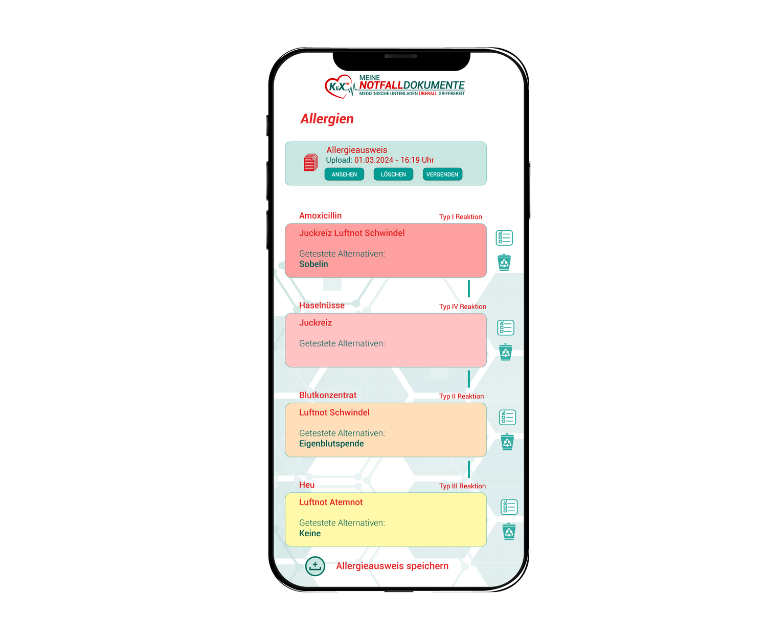 Die KliXFiX WebApp bietet eine klare und übersichtliche Darstellung von Allergien durch farblich dringliche Zuordnungen. So können Rettungskräfte sofort erkennen, welche Allergien besonders kritisch sind. Zusätzlich besteht die Möglichkeit, einen Allergieausweis zu hinterlegen, um im Notfall alle relevanten Informationen auf einen Blick zur Verfügung zu haben. Diese Funktion sorgt für eine schnelle und effektive Notfallversorgung, indem sie die wichtigsten Informationen hervorhebt und Zeit spart.