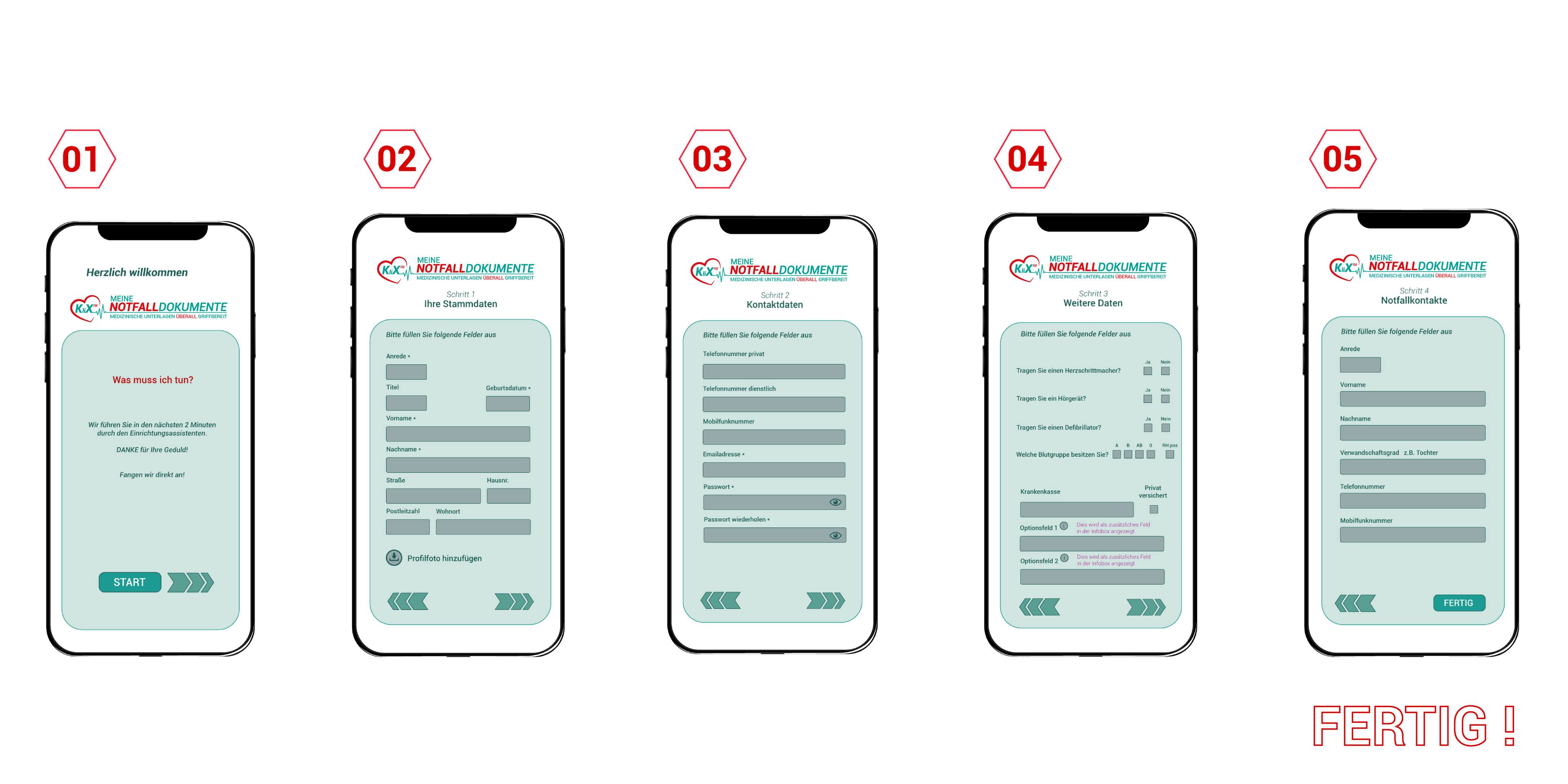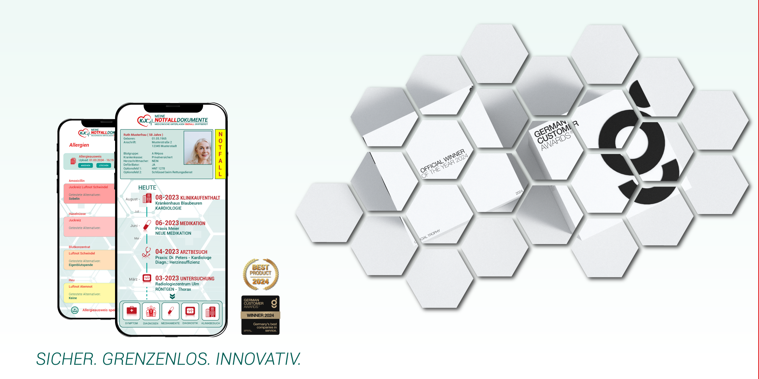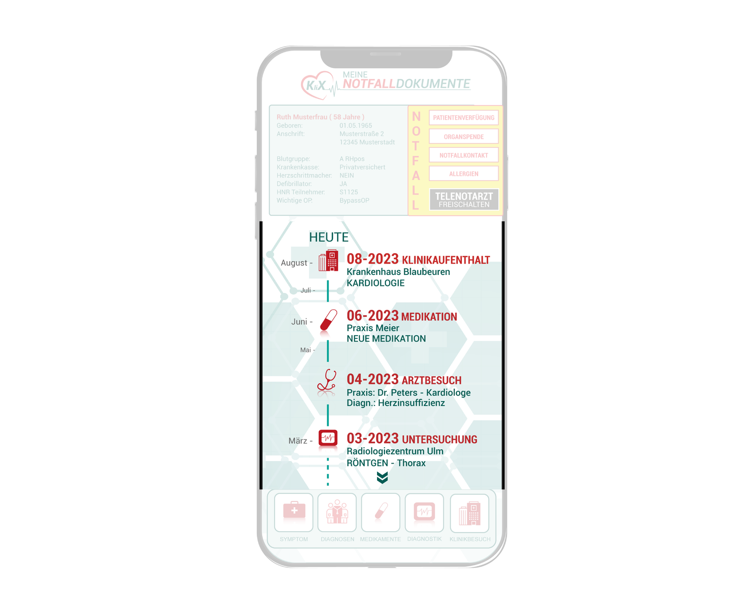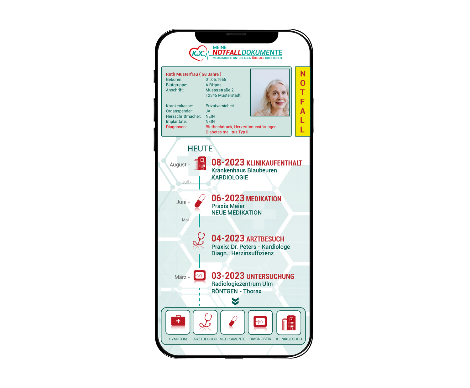 Das Dashboard ermöglicht durch die innovative Anordnung eine schnelle Übersicht und einen gezielten Zugriff auf die benötigten Informationen. Durch den Notfallreiter können die Rettungskräfte sofort den Willen des Patienten berücksichtigen und Kontakt zu den Angehörigen aufnehmen.